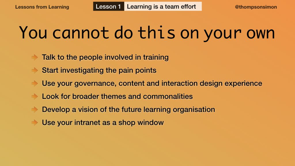 I would particularly recommend the course to the many people who have found themselves to be the solo intranet person, especially those with little grounding in user-centred design. This will give you sound principles to build upon, in user needs, accessibility, content creation and management, plus ongoing measurement and improvement.