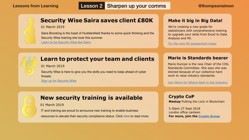 When we bring in learning of all kinds, we can start to create a home page that is about positive growth, and shows the business as it might become. “New security training is available” is dull, but it can be rewritten to make it relevant and give it a point such as “Learn to protect your team and clients”. It gets even better when you make it about people and feel personal. Here “Security Wise Saira saves client £80k” celebrates the success of successful training. There is almost always a training angle in a good news story.