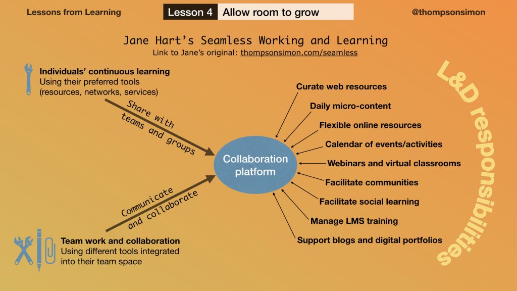 This is my redrawing of Jane’s diagram with, at its core, a collaboration platform – Jane’s talking about Slack or Microsoft Teams – with here Learning and Development’s responsibilities on the right, and the tools for managing a user’s own learning, as well as for team learning and collaboration, on the left.