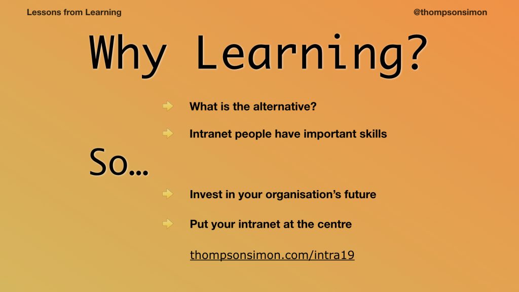 And we need to make sure the intranet is core to the business, its people, the digital workplace, continuous change, the learning it has to do.